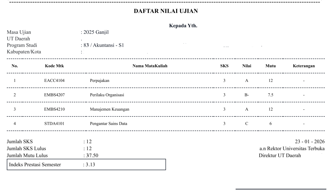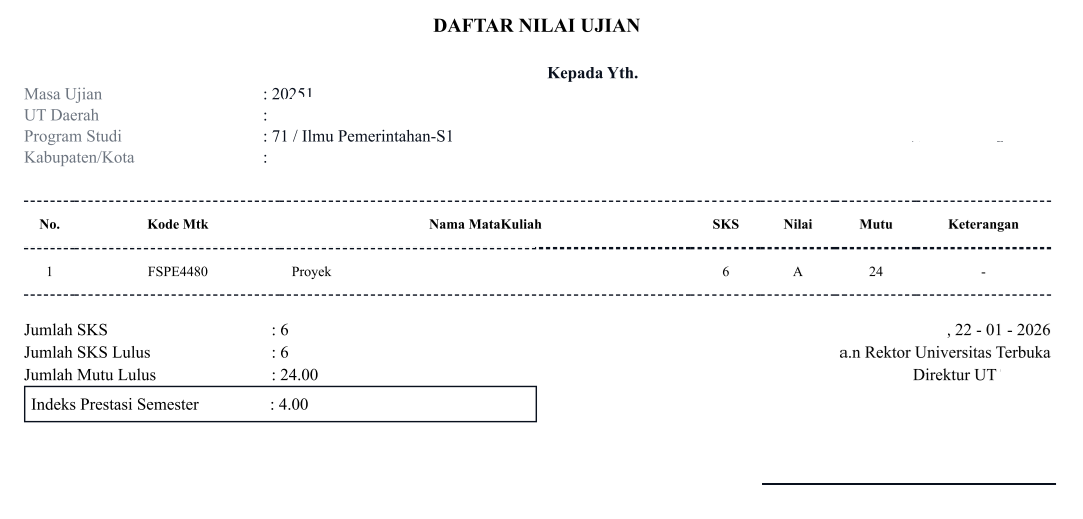 Kami berkomitmen memberikan hasil terbaik dan transparan. Berikut adalah kumpulan bukti nilai nyata (Nilai Akhir UAS, Tuton, UAS, Artikel Ilmiah, hingga Skripsi) dari klien kami.